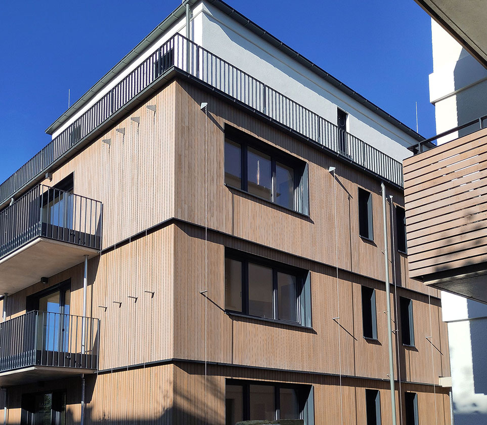 Alle Gebäude der Königsteiner Höfe weisen unterschiedliche Fassaden auf [von Backstein über Holz bis hin zu begrünten Fassaden], was für eine besonders ansprechende Architektursprache sorgt.